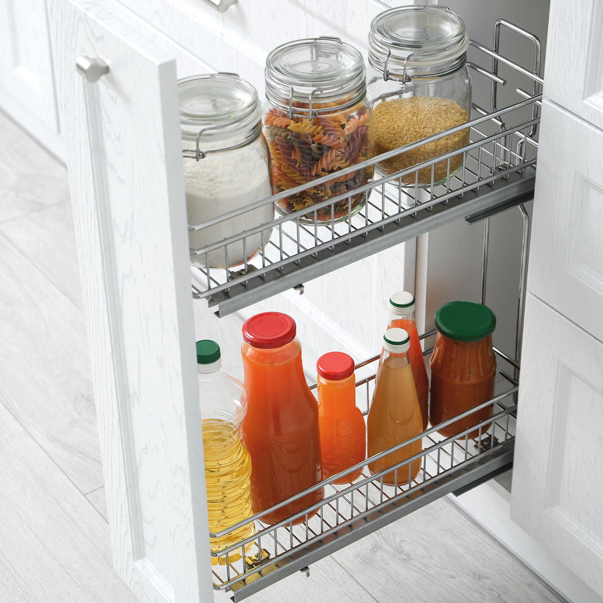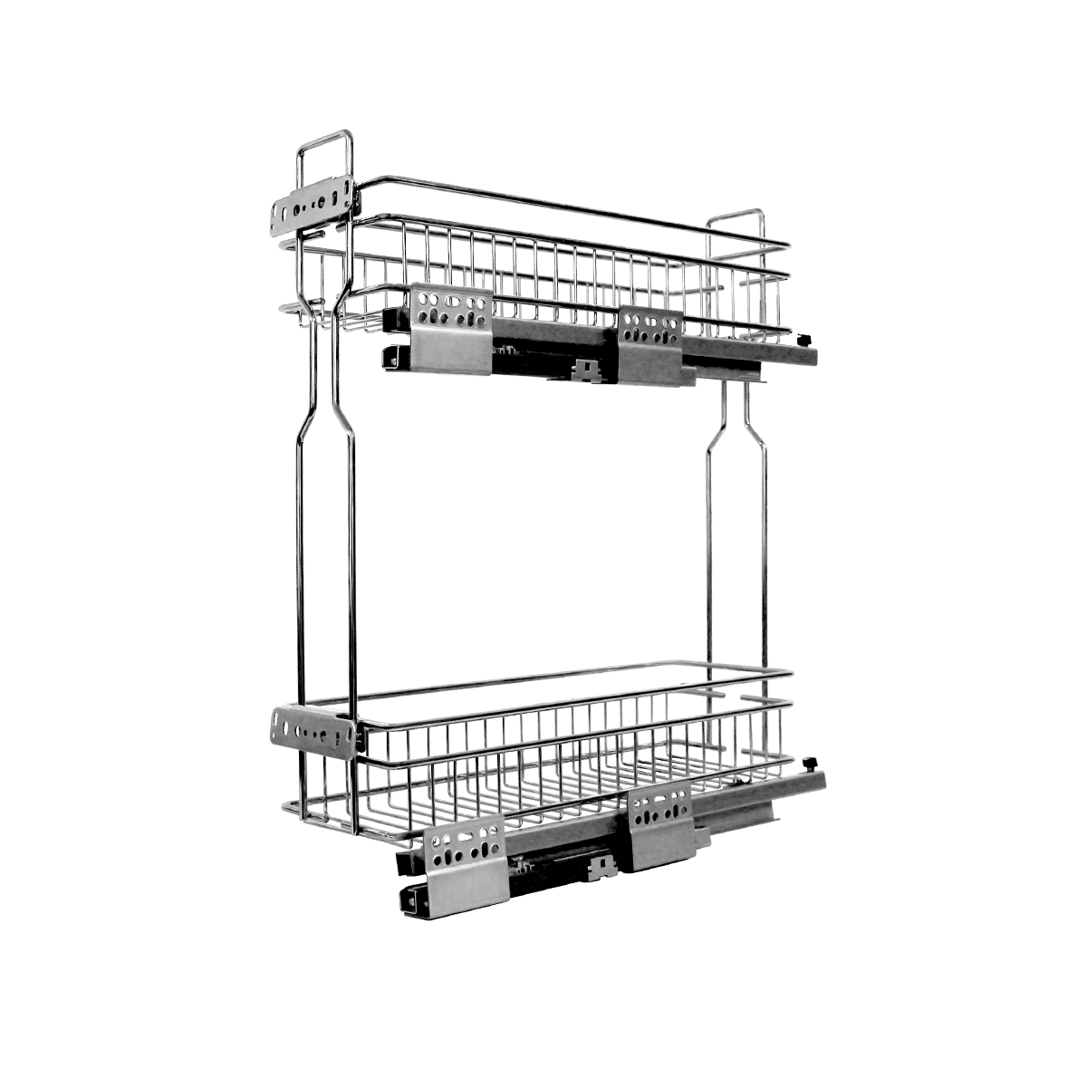 El botellero de 2 niveles KAB4099D está diseñado para aprovechar al máximo el espacio en gabinetes de 200 mm, ofreciendo practicidad y accesibilidad. Su apertura lateral hacia la derecha facilita el acceso a su contenido, ideal para cocinas donde cada centímetro cuenta.