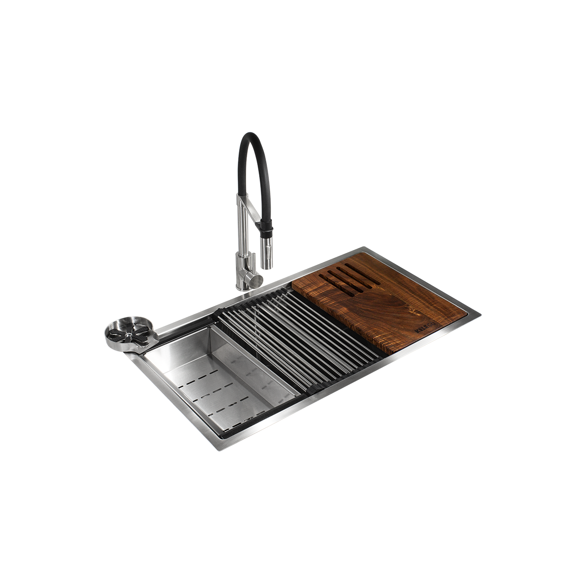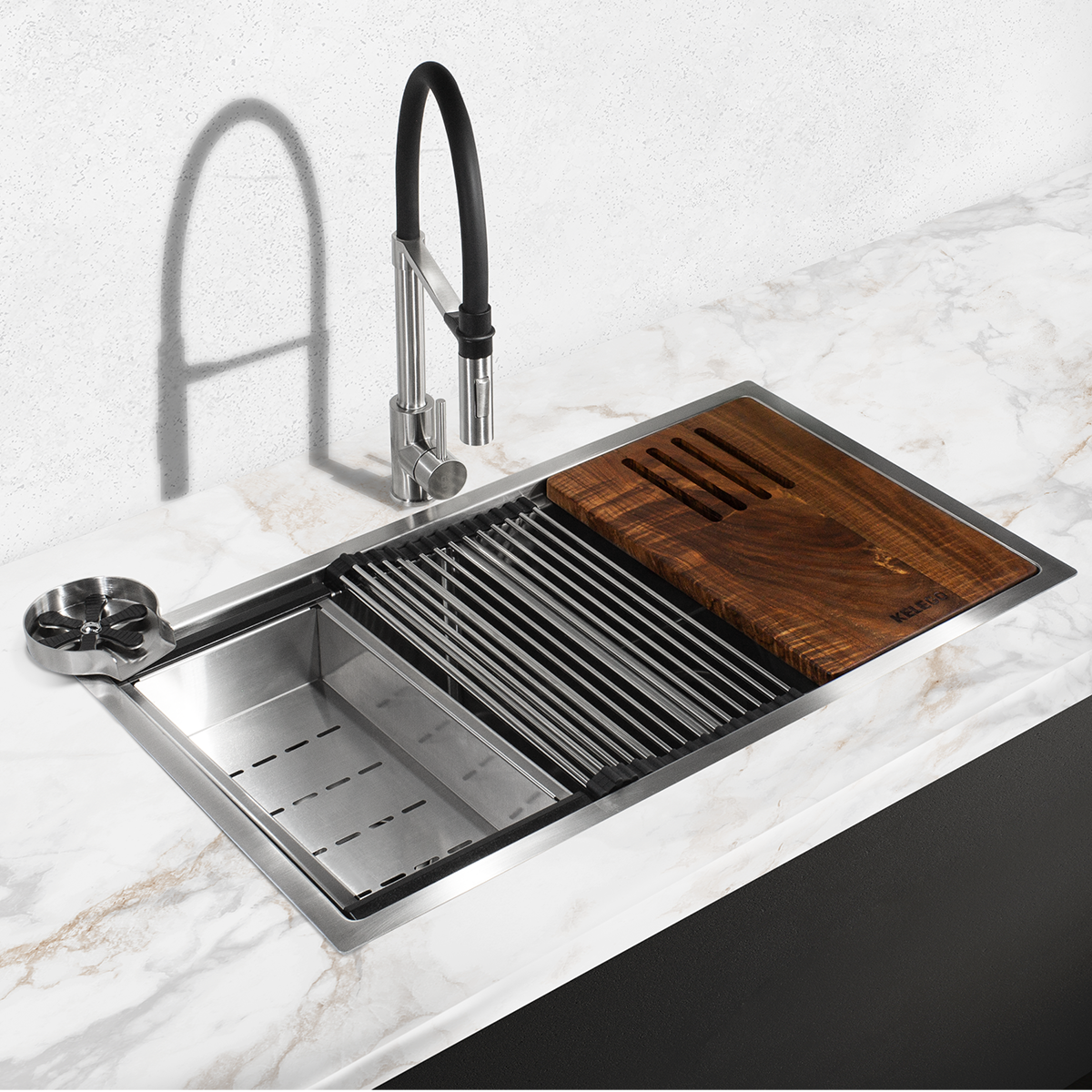 Transforma tu cocina con el Paquete KELE GO 3, una combinación de elegancia, resistencia y practicidad. Este set incluye una tarja de diseño cuadrado y una mezcladora monomando de cuello flexible, junto con accesorios que optimizan tu espacio y mejoran tu experiencia en la cocina.