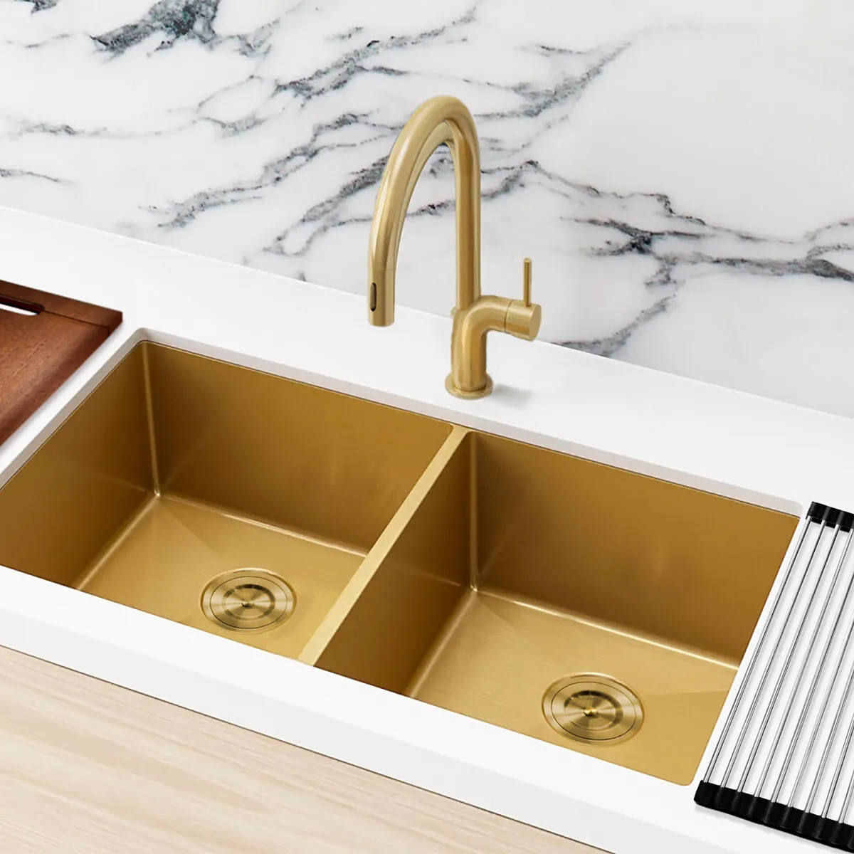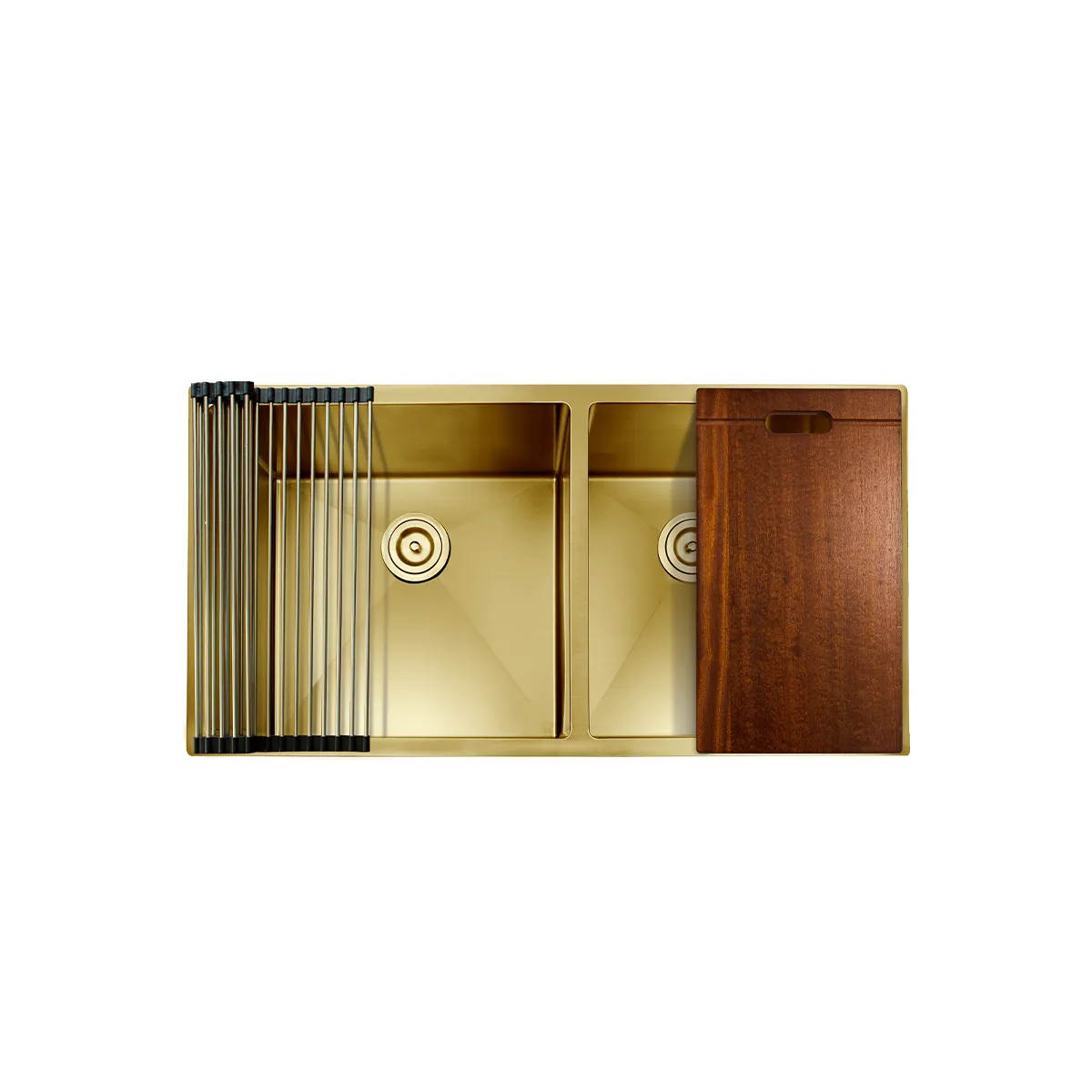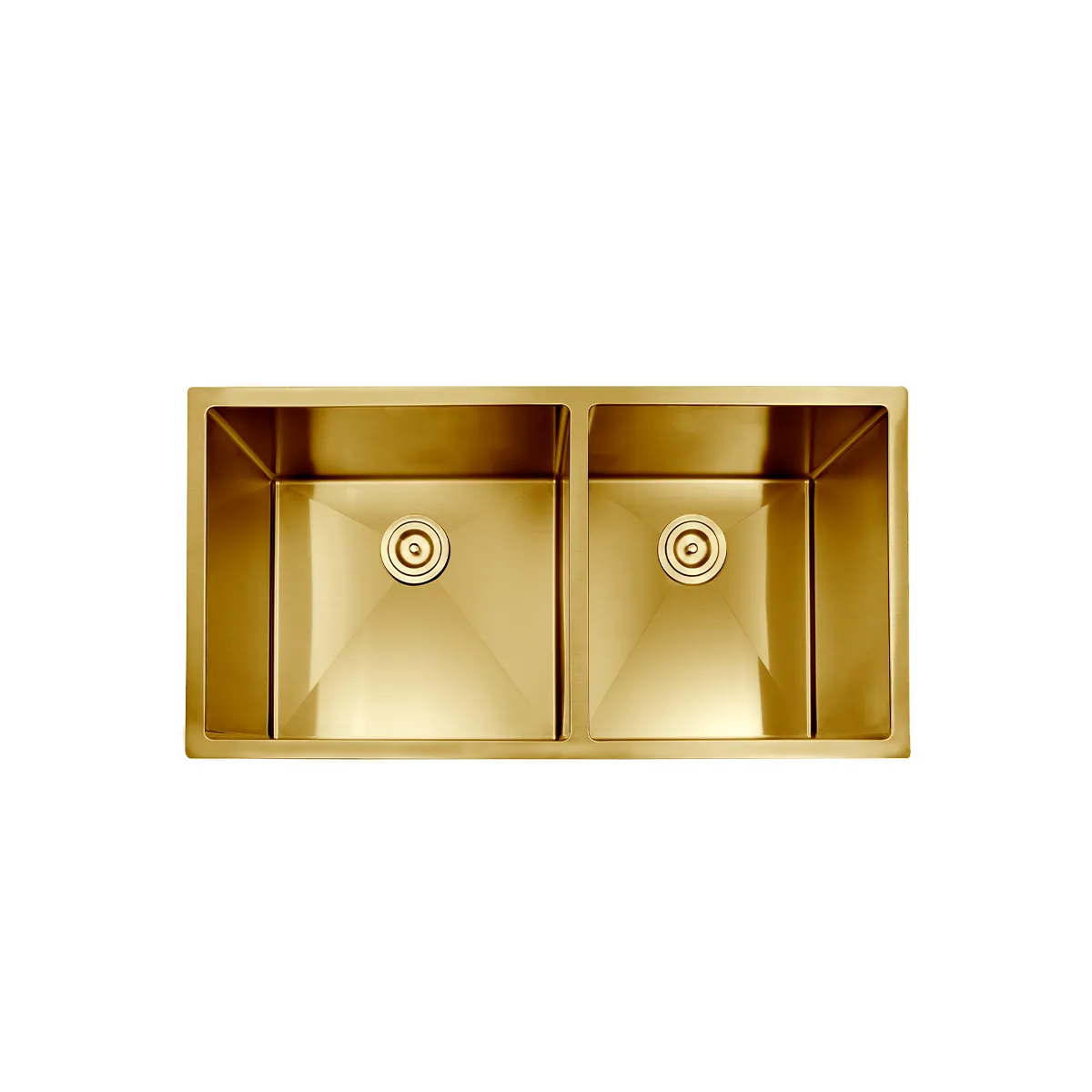 Diseñada para ser la pieza central de las cocinas más exclusivas, la tarja KHD3719A-GD representa la cumbre del lujo funcional y la eficiencia. Su configuración de doble tina permite una versatilidad superior, facilitando la organización de tareas simultáneas con una fluidez impecable. Estructuralmente, está fabricada en acero inoxidable de calibre 16, lo que ofrece una robustez industrial y una resistencia inigualable. Este modelo destaca por su deslumbrante acabado Gold, una tonalidad que proyecta opulencia y modernidad, transformando el área de lavado en una declaración de estilo audaz.